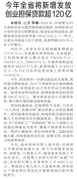 2023年,河南要为87万高校毕业生提供精准就业服务,持续促进40万农村劳动力转移就业;促进创业带动就业,新增发放创业担保贷款120亿元以上——昨日,记者从河南省人社厅获悉,我省明确2023年人社工作重点。(今日《郑州日报》2版)