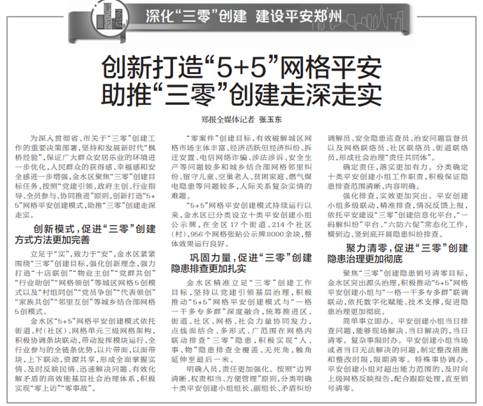 为深入贯彻省、市关于“三零”创建工作的重要决策部署,坚持和发展新时代“枫桥经验”,保证广大群众安居乐业的环境进一步优化,人民群众的获得感、幸福感和安全感进一步增强,金水区聚焦“三零”创建目标任务,按照“党建引领、政府主创、行业指导、全员参与、协同推进”原则,创新打造“5+5”网格平安创建模式,助推“三零”创建走深走实。(今日《郑州日报》2版)