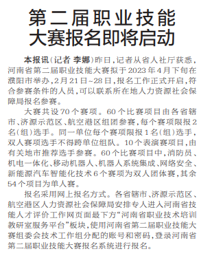 昨日,记者从省人社厅获悉,河南省第二届职业技能大赛拟于2023年4月下旬在濮阳市举办,2月21日~28日,报名工作正式开启,符合参赛条件的人员,可以联系所在地人力资源社会保障局报名参赛。(今日《郑州日报》2版)
