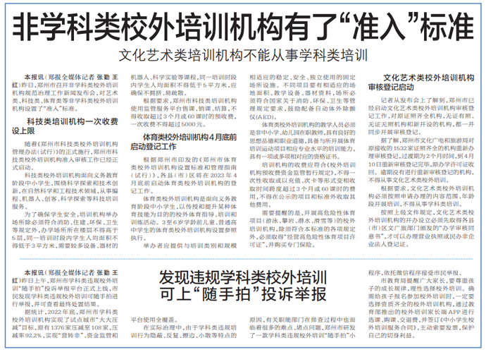 昨日,郑州市召开非学科类校外培训机构规范治理工作新闻发布会,对艺术类、科技类、体育类等非学科类校外培训机构设置了“准入”标准。(今日《郑州日报》5版)