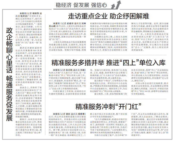 “在资料齐全、确认无误的情况下,我们在10个工作日内就可以给您的公司发放融资款项。”一场恳谈会,政企言肺腑。2月15日下午,惠济区刘寨街道裕华社区召开首期“政企面对面”恳谈会,辖区政府职能部门、共建单位、金融机构、企业负责人齐聚一堂,为企业奋战“开门红”送来一场“及时雨”。(今日《郑州日报》7版)