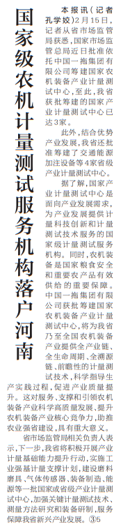 2月15日,记者从省市场监管局获悉,国家市场监管总局近日批准依托中国一拖集团有限公司筹建国家农机装备产业计量测试中心,至此,我省获批筹建的国家产业计量测试中心已达3家。(今日《河南日报》1版)