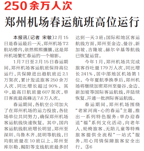 1月7日至2月15日春运期间,郑州机场客运航班保持高位运行,共保障进出港航班近2.1万架次,累计发送旅客250余万人次、同比增长超过90%。其中,最高日航班量607架次,单日客流最高峰达7.6万人次。(今日《河南日报》1版)