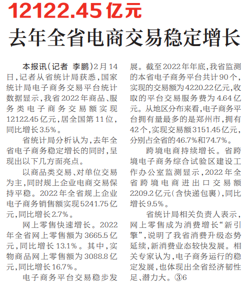 2月14日,记者从省统计局获悉,国家统计局电子商务交易平台统计数据显示,我省2022年商品、服务类电子商务交易额实现12122.45亿元,居全国第11位,同比增长3.5%。(今日《河南日报》1版)