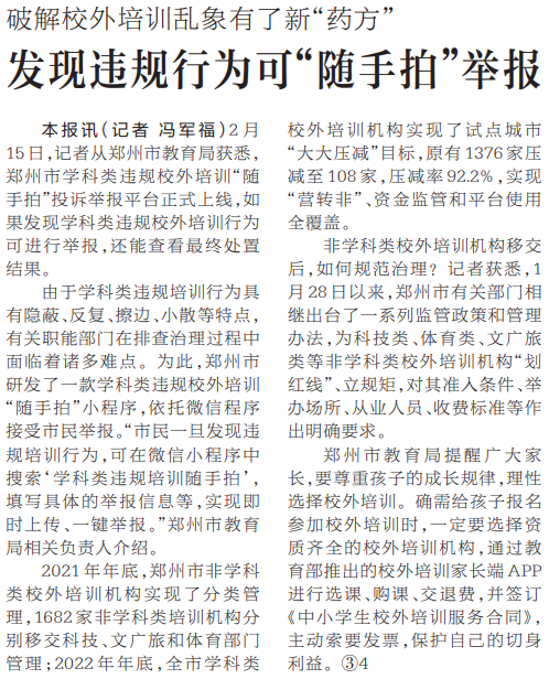 2月15日,记者从郑州市教育局获悉,郑州市学科类违规校外培训“随手拍”投诉举报平台正式上线,如果发现学科类违规校外培训行为可进行举报,还能查看最终处置结果。(今日《河南日报》4版)