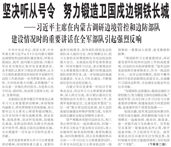 中共中央总书记、国家主席、中央军委主席习近平6月7日在内蒙古调研边境管控和边防部队建设情况,听取北部战区、陆军、驻内蒙古边防旅、内蒙古军区有关情况汇报并发表重要讲话。全军部队认真学习领会讲话精神,认为习主席的重要讲话深刻回答开创新时代边防工作新局面一系列带根本性、全局性、方向性的重大问题,必将激励广大官兵进一步强化责任担当,为党和人民守好边、固好防,坚决捍卫国家主权、安全、发展利益。(今日《人民日报》1版、2版)
