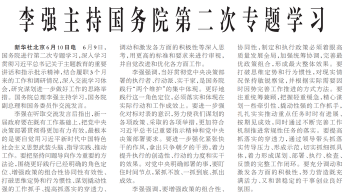 6月9日,国务院进行第二次专题学习,深入学习贯彻习近平总书记关于主题教育的重要讲话和指示批示精神,结合履职3个月来的工作和调研情况,深入交流学习体会,研究谋划进一步做好工作的思路举措。国务院总理李强主持学习,国务院副总理和国务委员作交流发言。(今日《人民日报》1版)