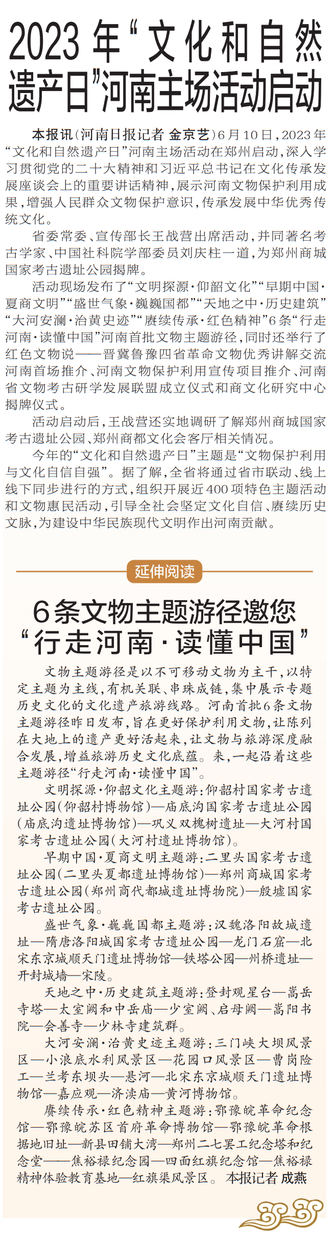 6月10日,2023年“文化和自然遗产日”河南主场活动在郑州启动。今年的“文化和自然遗产日”主题是“文物保护利用与文化自信自强”。活动现场发布6条“行走河南·读懂中国”河南首批文物主题游径。(今日《河南日报》1版)