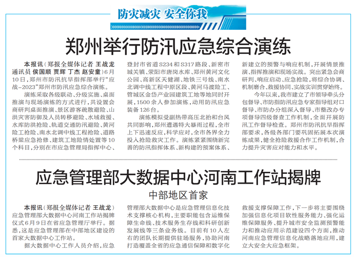 6月10日,郑州市防汛抗旱指挥部举行“应战-2023”郑州市防汛应急综合演练。 (今日《郑州日报》1版)