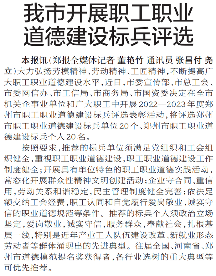 大力弘扬劳模精神、劳动精神、工匠精神,不断提高广大职工职业道德建设水平,近日,市委宣传部、市总工会、市委网信办、市工信局、市商务局、市国资委决定在全市机关企事业单位和广大职工中开展2022—2023年度郑州市职工职业道德建设标兵评选表彰活动,将评选郑州市职工职业道德建设标兵单位20个、郑州市职工职业道德建设标兵个人20名。(今日《郑州日报》1版)
