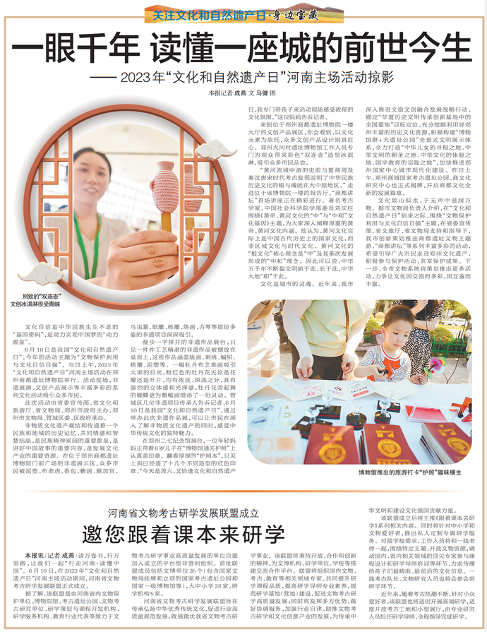 6月10日,2023年“文化和自然遗产日”河南主场活动在郑州启动,深入学习贯彻党的二十大精神和习近平总书记在文化传承发展座谈会上的重要讲话精神,展示河南文物保护利用成果,增强人民群众文物保护意识,传承发展中华优秀传统文化。(今日《郑州日报》1版)