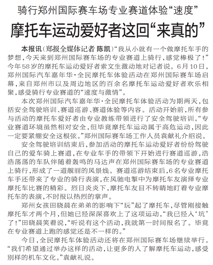 “我从小就有一个做摩托车手的梦想,今天来到郑州国际赛车场的专业赛道上骑行,感觉棒极了!”今年58岁的摩托车运动爱好者索文生激动地对记者说。6月10日,郑州国际汽车嘉年华·全民摩托车体验活动在郑州国际赛车场启幕,来自郑州市以及周边地区的百余名摩托车运动爱好者欢乐相聚,感受骑行专业赛道的“速度与激情”。(今日《郑州日报》2版)