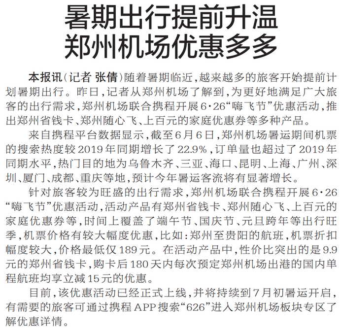 随着暑期临近,越来越多的旅客开始提前计划暑期出行。昨日,记者从郑州机场了解到,为更好地满足广大旅客的出行需求,郑州机场联合携程开展6·26“嗨飞节”优惠活动,推出郑州省钱卡、郑州随心飞、上百元的家庭优惠券等多种产品。(今日《郑州日报》2版)