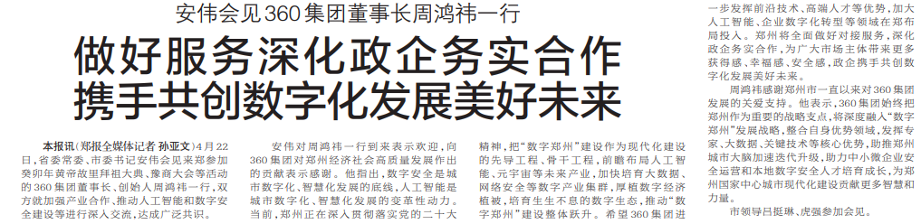 4月22日,省委常委、市委书记安伟会见来郑参加癸卯年黄帝故里拜祖大典、豫商大会等活动的360集团董事长、创始人周鸿祎一行,双方就加强产业合作、推动人工智能和数字安全建设等进行深入交流,达成广泛共识。