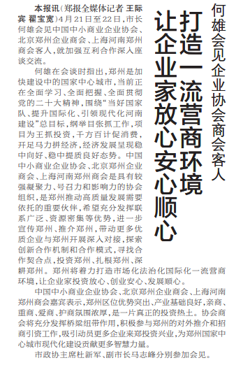 4月21日至22日,市长何雄会见中国中小商业企业协会、北京郑州企业商会、上海河南郑州商会客人,就加强互利合作深入座谈交流。