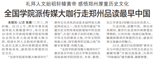 三月三,拜轩辕。22日上午,癸卯年黄帝故里拜祖大典隆重举行,来自全国20余所大学新闻传播学院和传媒杂志的负责人组成传媒大咖方阵,现场礼拜人文始祖轩辕黄帝,礼成后又深入郑州商都遗址博物院等地采风,感悟郑州厚重的历史文化。(今日《郑州日报》1版)