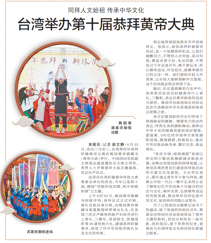 4月22日,农历三月初三,台湾癸卯年恭拜轩辕黄帝大典在桃园黄帝雷藏寺(黄帝大庙)举行。中国国民党前副主席胡志强受邀担任大典主拜官,各界人士齐聚黄帝大庙共襄盛典,见证庄严仪式。(今日《郑州日报》2版)