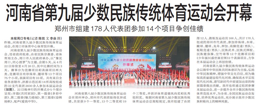 昨晚,河南省第九届少数民族传统体育运动会,在周口市体育中心体育馆开幕。(今日《郑州日报》8版)
