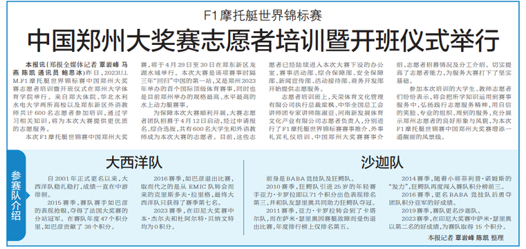昨日,2023U.I.M.F1摩托艇世界锦标赛中国郑州大奖赛志愿者培训暨开班仪式在郑州大学体育学院举行。来自郑大体院、华北水利水电大学两所高校以及郑东新区外语教师共计600名志愿者参加培训,通过学习相关知识,将为本次大赛提供更优质的志愿服务。(今日《郑州日报》8版)