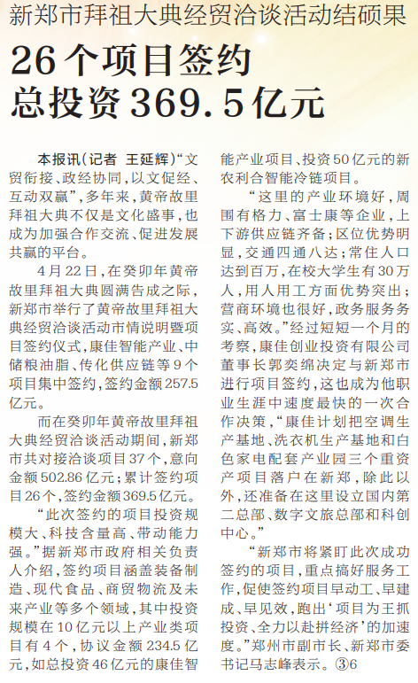 4月22日,在癸卯年黄帝故里拜祖大典圆满告成之际,新郑市举行了黄帝故里拜祖大典经贸洽谈活动市情说明暨项目签约仪式,康佳智能产业、中储粮油脂、传化供应链等9个项目集中签约,签约金额257.5亿元。