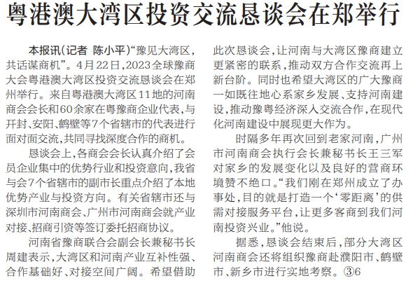 “豫见大湾区,共话谋商机”。4月22日,2023全球豫商大会粤港澳大湾区投资交流恳谈会在郑州举行。来自粤港澳大湾区11地的河南商会会长和60余家在粤豫商企业代表,与开封、安阳、鹤壁等7个省辖市的代表进行面对面交流,共同寻找深度合作的商机。(今日《河南日报》3版)