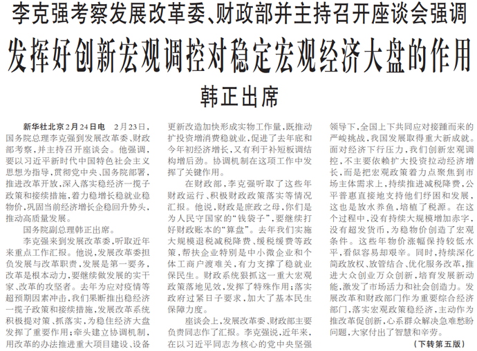 2月23日,国务院总理李克强到发展改革委、财政部考察,并主持召开座谈会。他强调,要以习近平新时代中国特色社会主义思想为指导,贯彻党中央、国务院部署,推进改革开放,深入落实稳经济一揽子政策和接续措施,着力稳增长稳就业稳物价,巩固当前经济增长企稳回升势头,推动高质量发展。(今日《人民日报》1版、5版)