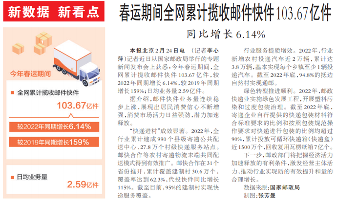 记者近日从国家邮政局举行的专题新闻发布会上获悉:今年春运期间,全网累计揽收邮件快件103.67亿件,较2022年同期增长6.14%,较2019年同期增长159%;日均业务量2.59亿件。(今日《人民日报》1版)