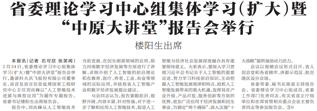 2月24日,省委理论学习中心组集体学习(扩大)暨“中原大讲堂”报告会举行,邀请科大讯飞股份有限公司董事长、语音及语言信息处理国家工程研究中心主任刘庆峰以“人工智能技术进展与典型应用”为题作专题报告。省委书记楼阳生出席报告会。(今日《河南日报》1版)