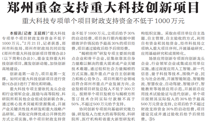 “重大科技专项单个项目财政支持资金不低于1000万元。”2月21日,记者获悉,郑州市科技局、郑州市财政局共同印发《郑州市重大科技创新项目管理办法》,重金支持重大科技创新项目,激发创新动能,加快创新高地建设。(今日《河南日报》1版)
