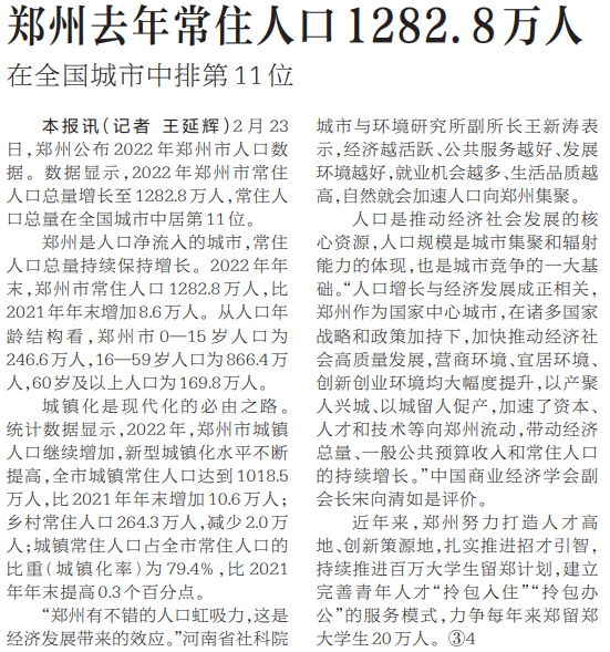 2月23日,郑州公布2022年郑州市人口数据。数据显示,2022年郑州市常住人口总量增长至1282.8万人,常住人口总量在全国城市中居第11位。(今日《河南日报》2版)