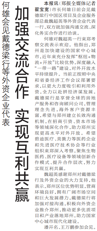市长何雄日前会见戴德梁行中国区项目及企业服务部总裁魏超英等外资企业代表一行,双方就加强沟通交流、深化务实合作进行洽谈。(今日《郑州日报》1版)