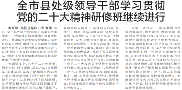 昨日,全市县处级主要领导干部学习贯彻党的二十大精神研修班继续在市委党校进行。特邀河南省委党校哲学教研部主任田宪臣教授,围绕“习近平新时代中国特色社会主义思想的世界观和方法论”,以及中国工业互联网研究院院长鲁春丛,围绕“工业互联网推动制造业数字化转型”分别进行授课。(今日《郑州日报》1版)