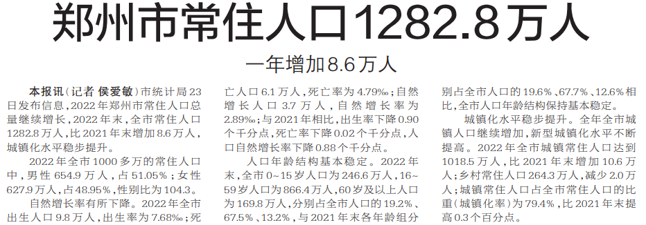市统计局23日发布信息,2022年郑州市常住人口总量继续增长,2022年末,全市常住人口1282.8万人,比2021年末增加8.6万人,城镇化水平稳步提升。(今日《郑州日报》1版)