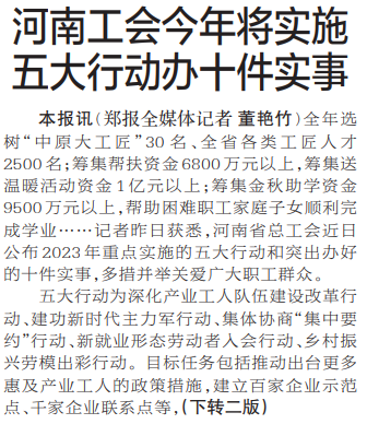全年选树“中原大工匠”30名、全省各类工匠人才2500名;筹集帮扶资金6800万元以上,筹集送温暖活动资金1亿元以上;筹集金秋助学资金9500万元以上,帮助困难职工家庭子女顺利完成学业……记者昨日获悉,河南省总工会近日公布2023年重点实施的五大行动和突出办好的十件实事,多措并举关爱广大职工群众。(今日《郑州日报》1版、2版)