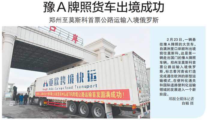 2月23日,一辆悬挂豫A牌照的大货车,自满洲里口岸顺利出境前往莫斯科,这是第一辆走出国门的豫A牌照车辆。郑州至莫斯科首票公路运输入境俄罗斯,标志着河南省打造完成通往欧洲的新型运输模式,在便利化通关和国际道路便利化运输领域的发展进入一个新阶段。(今日《郑州日报》1版)