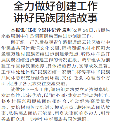 2月24日,市民族宗教局到中牟县调研民族团结进步创建工作。(今日《郑州日报》2版)