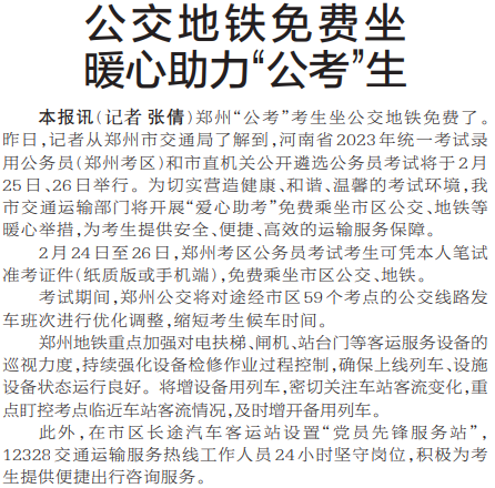 郑州“公考”考生坐公交地铁免费了。昨日,记者从郑州市交通局了解到,河南省2023年统一考试录用公务员(郑州考区)和市直机关公开遴选公务员考试将于2月25日、26日举行。为切实营造健康、和谐、温馨的考试环境,我市交通运输部门将开展“爱心助考”免费乘坐市区公交、地铁等暖心举措,为考生提供安全、便捷、高效的运输服务保障。(今日《郑州日报》1版)