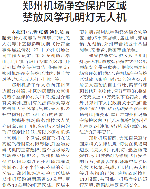 郑州机场净空保护区域禁放风筝孔明灯无人机