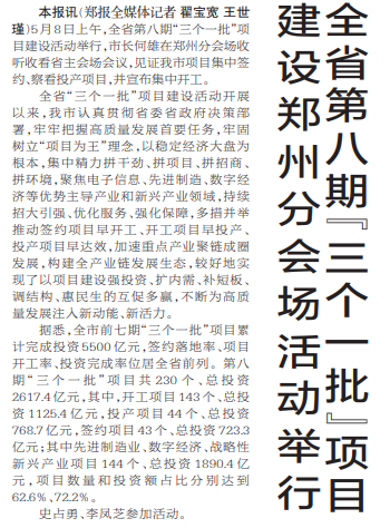 5月8日上午,全省第八期“三个一批”项目建设活动举行,市长何雄在郑州分会场收听收看省主会场会议,见证我市项目集中签约、察看投产项目,并宣布集中开工。