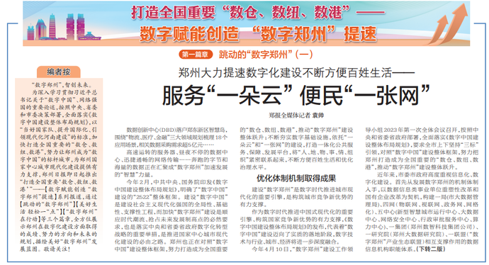 为深入学习贯彻习近平总书记关于“数字中国”、网络强国的重要论述,按照中央、省委和市委决策部署,全面落实《数字中国建设整体布局规划》,以“当好国家队、提升国际化、引领现代化河南建设”的标准,加快打造全国重要的“数仓、数纽、数港”,努力让郑州成为“数字中国”的标杆城市,为郑州国家中心城市现代化建设提供有力支撑,郑州日报即日起推出“打造全国重要‘数仓、数纽、数港’”——【数字赋能创造 “数字郑州”提速】系列报道,通过【跳动的“数字郑州”】【美好生活 轻松一“点”】【“数字郑州”在行动】等三个篇章,全方位展示郑州在数字化建设方面取得的成绩、努力的方向和未来的规划,描绘美好“数字郑州”发展蓝图。敬请关注!