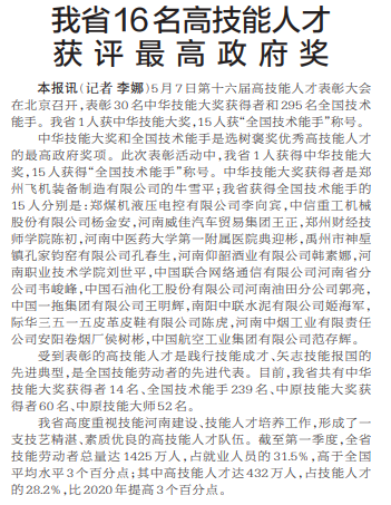 5月7日第十六届高技能人才表彰大会在北京召开,表彰30名中华技能大奖获得者和295名全国技术能手。我省1人获中华技能大奖,15人获“全国技术能手”称号。(今日《郑州日报》1版)