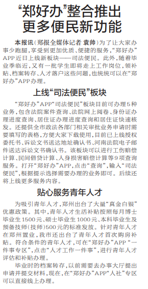 为了让大家办事少跑腿,享受到更加优质、便捷的服务,“郑好办”APP近日上线新板块——司法便民。此外,随着毕业季临近,又有一批学生即将走上工作岗位,领补贴、档案转存、人才落户这些问题,也统统可以在“郑好办”APP办理。(今日《郑州日报》2版)