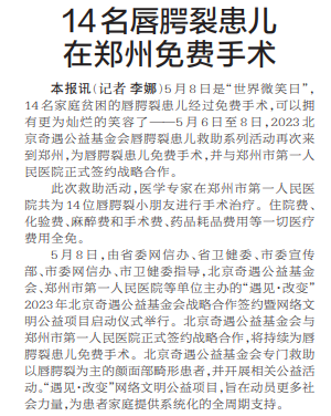 5月8日是“世界微笑日”,14名家庭贫困的唇腭裂患儿经过免费手术,可以拥有更为灿烂的笑容了——5月6日至8日,2023北京奇遇公益基金会唇腭裂患儿救助系列活动再次来到郑州,为唇腭裂患儿免费手术,并与郑州市第一人民医院正式签约战略合作。(今日《郑州日报》2版)