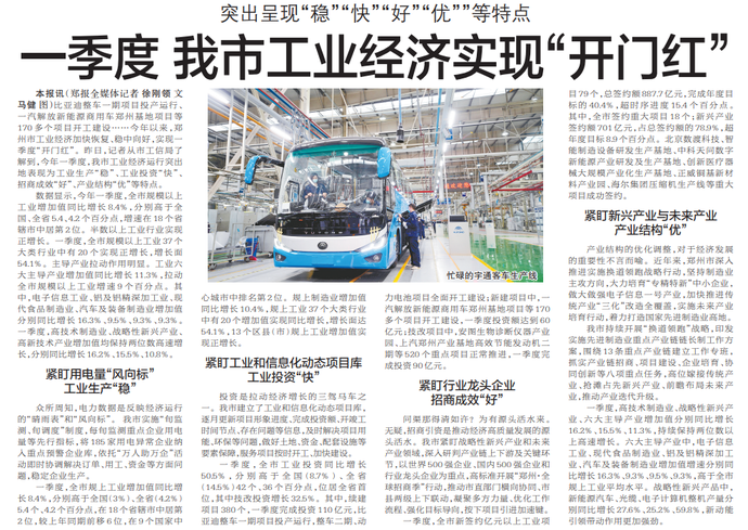 比亚迪整车一期项目投产运行、一汽解放新能源商用车郑州基地项目等170多个项目开工建设……今年以来,郑州市工业经济加快恢复、稳中向好,实现一季度“开门红”。昨日,记者从市工信局了解到,今年一季度,我市工业经济运行突出地表现为工业生产“稳”、工业投资“快”、 招商成效“好”、产业结构“优”等特点。(今日《郑州日报》5版)