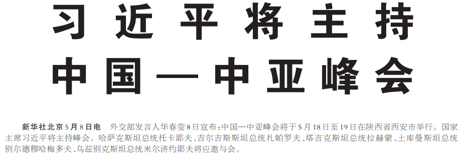 外交部发言人华春莹8日宣布:中国—中亚峰会将于5月18日至19日在陕西省西安市举行。国家主席习近平将主持峰会。哈萨克斯坦总统托卡耶夫、吉尔吉斯斯坦总统扎帕罗夫、塔吉克斯坦总统拉赫蒙、土库曼斯坦总统别尔德穆哈梅多夫、乌兹别克斯坦总统米尔济约耶夫将应邀与会。(今日《人民日报》1版)