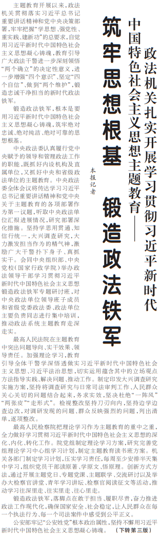 主题教育开展以来,政法机关贯彻落实习近平总书记重要讲话精神和党中央决策部署,牢牢把握“学思想、强党性、重实践、建新功”的总要求,自觉用习近平新时代中国特色社会主义思想凝心铸魂,教育引导广大政法干警进一步深刻领悟“两个确立”的决定性意义,进一步增强“四个意识”、坚定“四个自信”、做到“两个维护”,锻造忠诚干净担当的新时代政法铁军。(今日《人民日报》1版、3版)