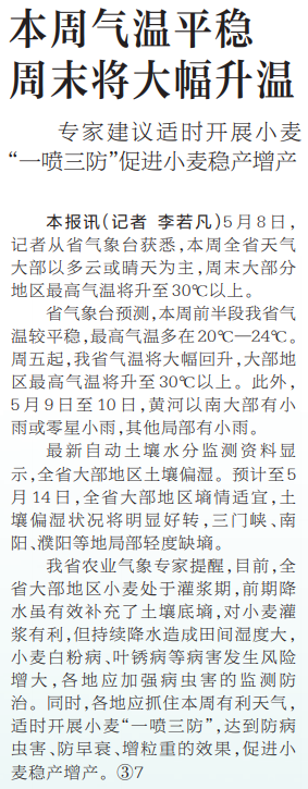 5月8日,记者从省气象台获悉,本周全省天气大部以多云或晴天为主,周末大部分地区最高气温将升至30℃以上。(今日《河南日报》2版)