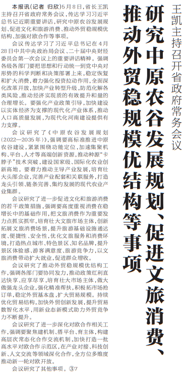 5月8日,省长王凯主持召开省政府常务会议,传达学习习近平总书记近期重要讲话,研究中原农谷发展规划、促进文化和旅游消费、推动外贸稳规模优结构、加强对欧合作等事项。(今日《河南日报》1版)