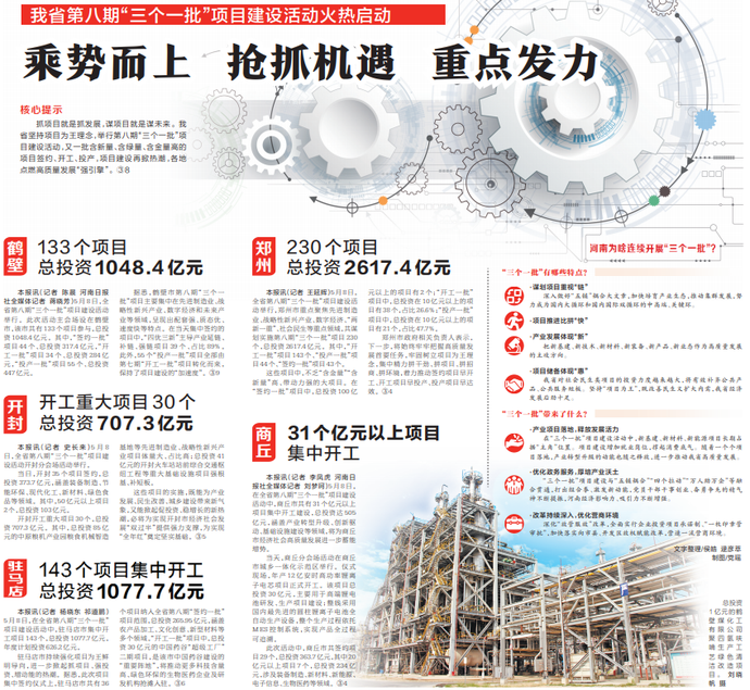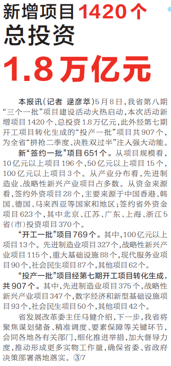 5月8日,我省第八期“三个一批”项目建设活动火热启动,本次活动新增项目1420个、总投资1.8万亿元,此外经第七期开工项目转化生成的“投产一批”项目共907个,为全省“拼抢二季度、决胜双过半”注入强大动能。(今日《河南日报》3版)