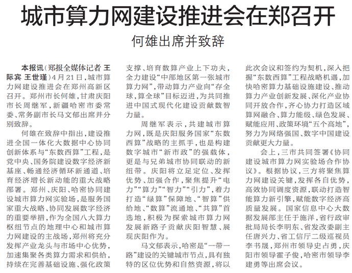 4月21日,城市算力网建设推进会在郑州高新区召开。郑州市长何雄,甘肃庆阳市长周继军,新疆哈密市委常委、常务副市长马文郁出席并分别致辞。(今日《郑州日报》1版)